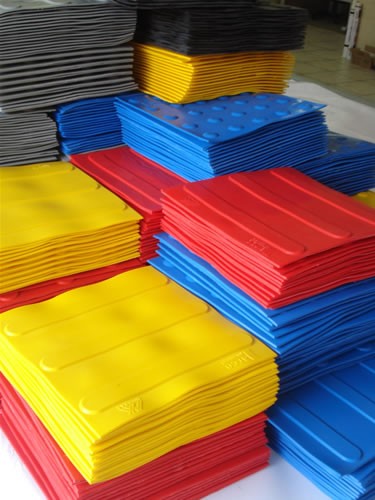 São dois tipos de piso tatil de borracha:os direcionais, que são com linhas longitudinais em relevo para demarcar a direção e o alerta eles são formados por superfície de tipo de moeda que serve para indicação de mudanças de direção.