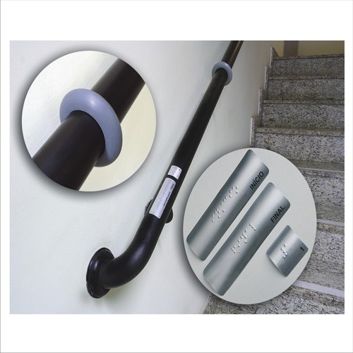 Com a Sinalização Braille para corrimão você evitará acidentes e quedas de pessoas com deficiencia visual em escadas. A sinalização deve ser feita no início e no final do corrimão com os seguintes materiais: Anel e Placa indicativa, esta placa deve ser em braile.